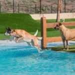 Outdoor dog waterpark with paradise beaches,low-water dog fountains and a jump platform.